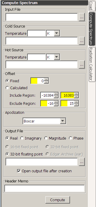 a selected group of subfiles. To use the Compute Spectrum tool, you must at a minimum specify a raw igram Input File. This can be a single file or a multifile. You can also optionally specify a Cold Source file and Temperature, a Hot Source file and Temperature, the Offset calculation method, the Apodization method, and the Output File type and filename. Once your input parameters are specified, press the Compute button and Edgar will generate the output spectral file. The number of subfiles in the output file will match the number of subfiles in the input file. If a Cold Source and Hot Source are not specified, the output spectra will be uncorrected raw spectra. The X Units parameter in the header of the output file will be set to "Wavenumber in cm-1". If specified, the Cold Source and Hot Source must have exactly two subfiles, with the first subfile an igram for the forward direction, and the second subfile an igram for the reverse direction. The Temperature units may be specified in either K or C. The default is K. If C is selected, then 273.15 is added when computing the blackbody curve for the source. The Offset controls(3) are used to control calculation of an offset value that is subtracted from the raw igrams before the FFT operation is performed. The default is a Fixed offset of zero. If you select the Fixed Offset mode, you can enter any value you wish for the offset. If you select Calculated, you can set the include region and the exclude region to calculate the offset for the each subfile. All samples inside the include region are include in a sum (unless these samples fall inside the exclude region). The sum is divided by the number of samples in the region to calculate the offset. If the Calculated option is set when you press compute, a new offset will be calculated (and displayed in the offset box) for each scan as it is processed. The choices for Apodization method are Beer-Norton (weak), Beer-Norton (medium), Beer-Norton (strong), Blackman-Harris, Boxcar, Cosine, Gaussian, Hamming(4), and Triangular (also known as "Bartlet"). The Output File type can be specified to be Real, Imaginary, Magnitude(5), or Phase. By default, the output file is auto named by taking the input file and appending ".rrad" for Real, ".irad" for Imaginary, ".mrad" for Magnitude, and ".prad" for Phase. The name will be auto changed whenever you change the input file name, or whenever you select the output file type. You can also manually set the output file name to any valid file name. Currently, the only output option for spectral files is 32-bit floating point. The Header Memo field is used to enter text for the header memo. Text entered here will be appended to any text present in the memo field of the raw input file and placed in the memo field of the output file header. |