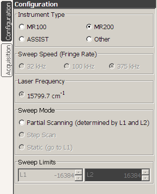 The Configuration panel is used to control instrument specific options, and in normal operation will not be used by most users. The Instrument Type is defined by the actual interferometer hardware in your system. The Sweep Speed options set the scan arm speed in terms of metrology fringe frequency. Available speeds will vary based on the Instrument Type. The Sweep Mode settings can be used to remove the instrument from the normal dynamic operating mode and place it in a Partial Scanning mode, with Sweep Limits set by the L1 and L2 controls. L1 and L2 are the minimum and maximum sweep points (in terms of metrology fringes) and are only enabled when in partial scanning mode. Otherwise, L1 and L2 will correspond to sweep limits required by the Spectral Resolution settings from the Acquisition panel. Step Scan mode is not currently implemented. In Static mode, the L2 input is disabled and the instrument is driven to a fixed position as specified in L1. Options are available for integrated control of aperture, blackbody, focus, INS, and scene mirror. Instrument control can be set up for a local direct connection, or as a client control for a network connected system. |
