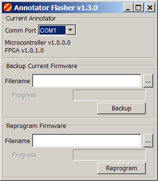 The current Annotator microcontroller and FPGA firmware versions numbers are displayed in the top panel of the Annotator Flasher. Before installing new firmware, it is always a good idea to backup your old firmware. Do this using the Backup button in the Backup Current Firmware panel. You can specify any valid filename for your system, but normally the programming file will have a ”.rpd” extension. After your backup is complete, specify the filename for the new firmware in the Reprogram Firmware panel, then press Reprogram. Once this completes, you will need to exit Edgar, power cycle your instrument, then restart Edgar. |